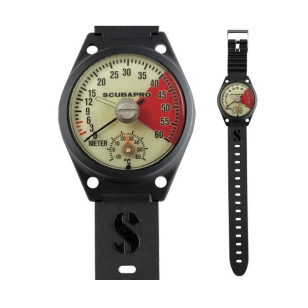 이 편리한 수심 게이지는 형광성 바탕에 온도계를 내장하고 있으며 간소하고, 손목 스트랩에 편안하게 잘 맞습니다.