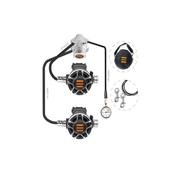 V1 요크 1단계 + TEC2 2단계 + 저압 러버호스 60cm + 저압 러버호스 200cm + 52mm 300bar SPG + 고압 러버호스 61cm + 스텐싱글스냅 88mm 2개 + 호흡기 가방