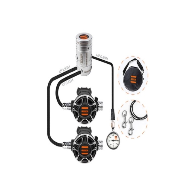 R2 요크/딘 1단계 1개 + TEC2 2단계 2개 + 저압호스 60cm + 저압호스 193cm or 200cm + 52mm 300bar SPG 1개 + 고압 호스 60cm 1개 + 스텐싱글스냅 88mm 2개 + 호흡기 가방
