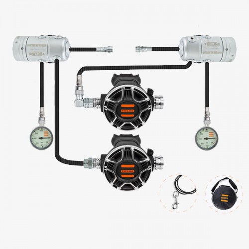 R2 스위벨 1단계 2개 + TEC2 2단계 2개 + 저압 러버호스 60cm + 저압 러버호스 193cm or 200cm + 5번포트 2개 + 인플레이트호스 20cm 2개 + 52mm 300bar SPG 2개 + 고압호스 20cm 2개 + 스텐싱글스냅 88mm 1개 + 90도 스위벨 + 호흡기 가방